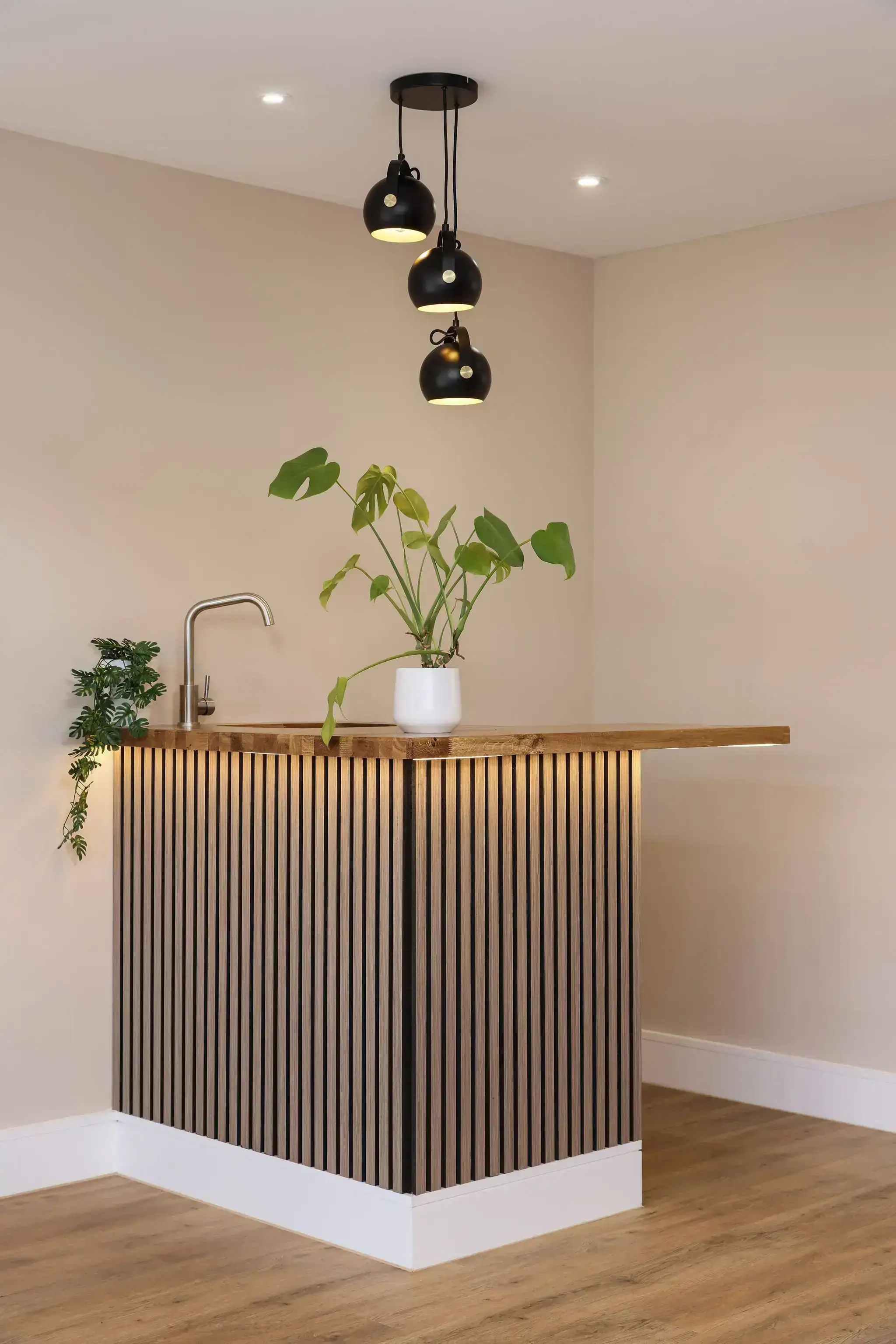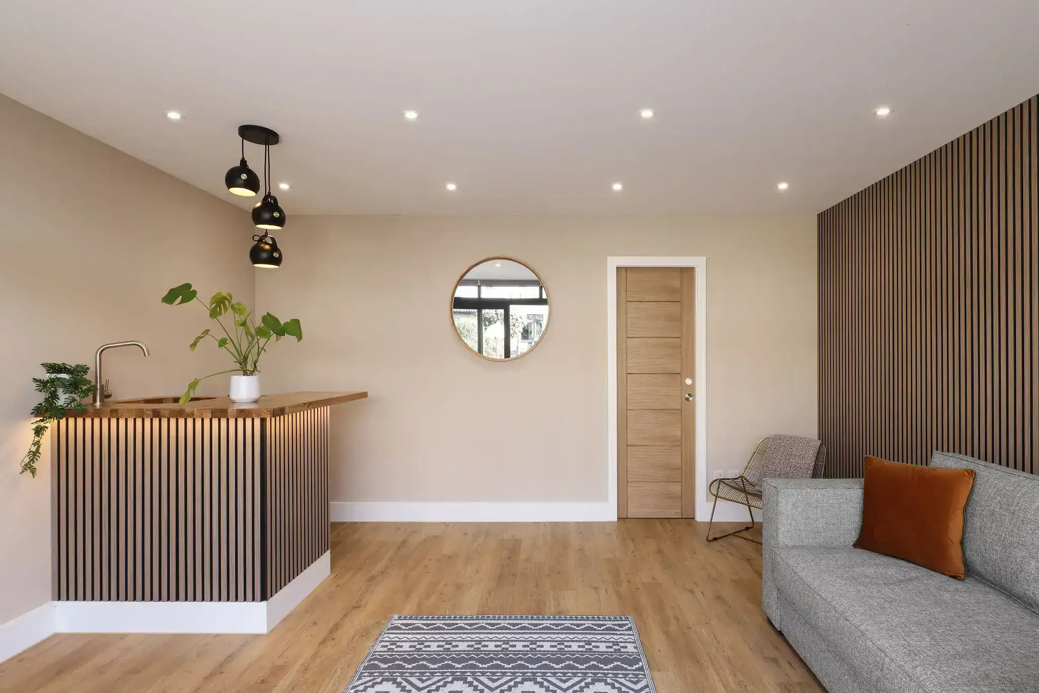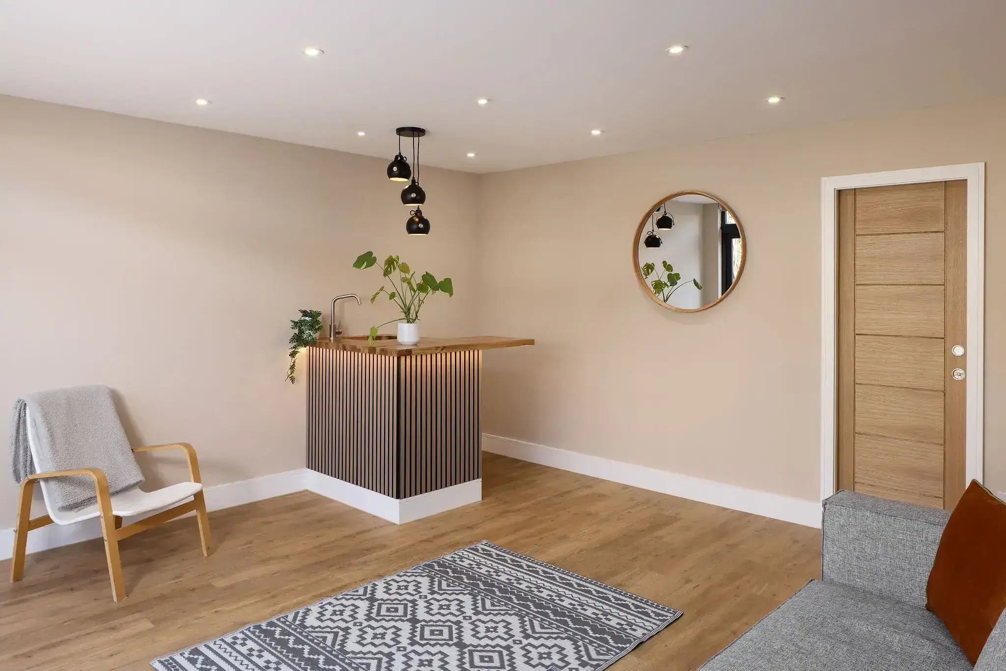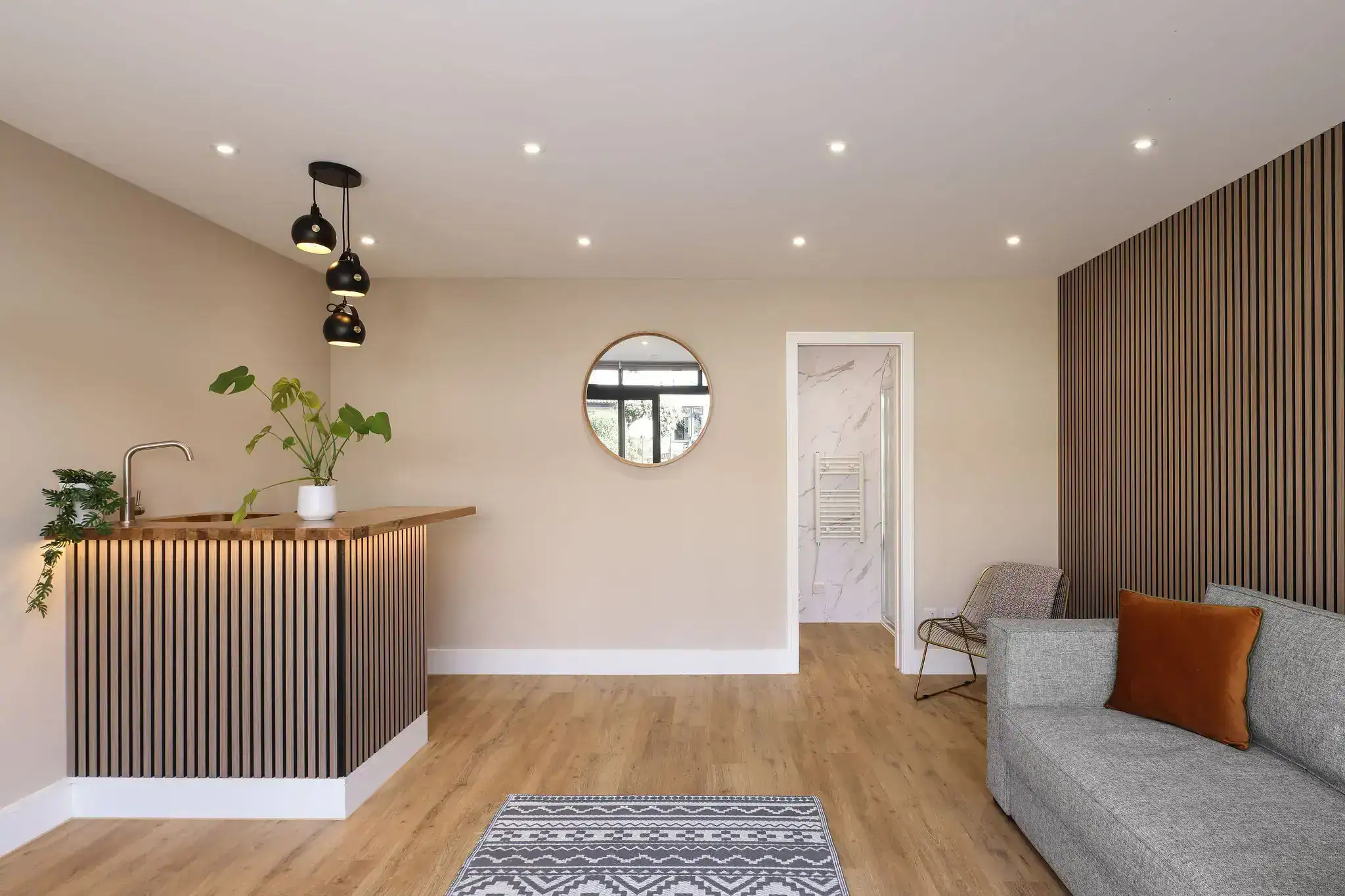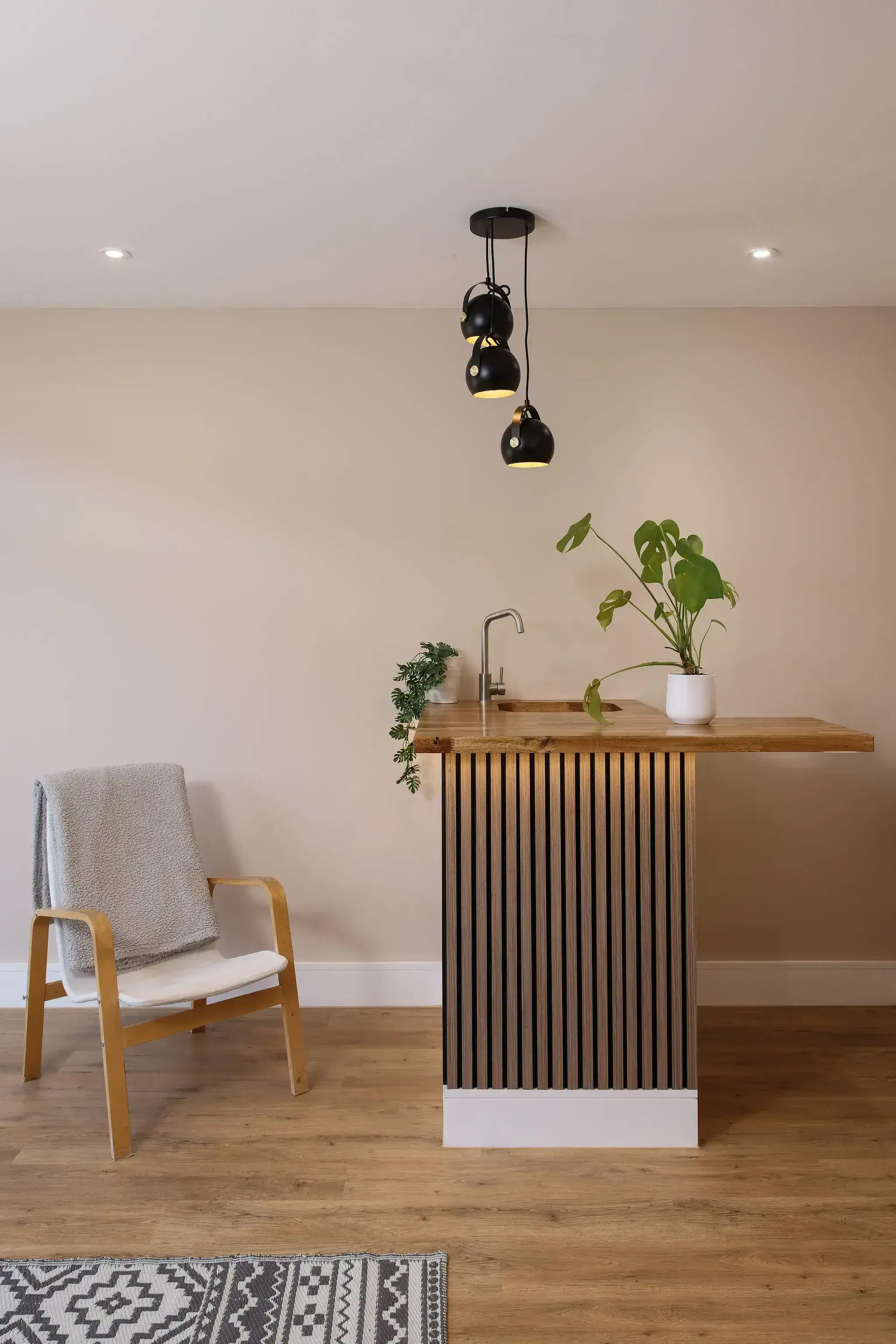 - Compact kitchenette with timber worktop